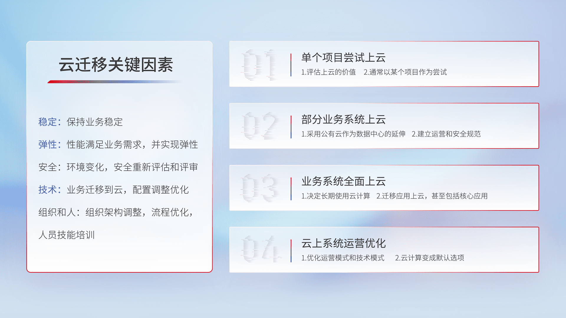 结合实际业务,,,从规划设计、、、云平台选型、、云原生改造、、、、数据迁移、、、集成交付,,,迁移全过程为客户识别最佳上云路径,,,做好风险识别管理,,,设计网络架构、、、身份权限、、安全审计合规、、、操作审计、、、日志审计、、、、监控告警策略、、、多站点容灾设计等,,,对云上基础设施进行整体规划,,,提升IT治理水平,,以满足弹性、、、高可用、、、高性能的需求。。。