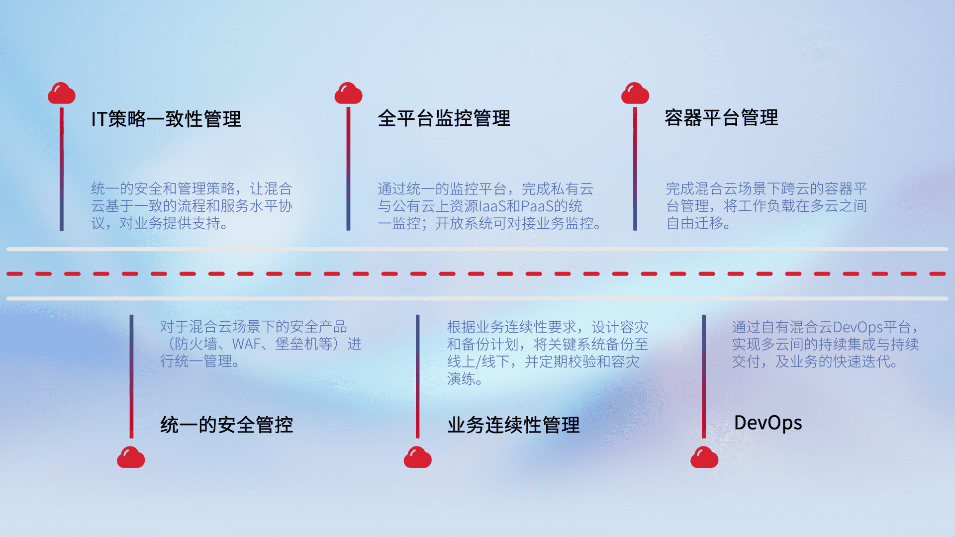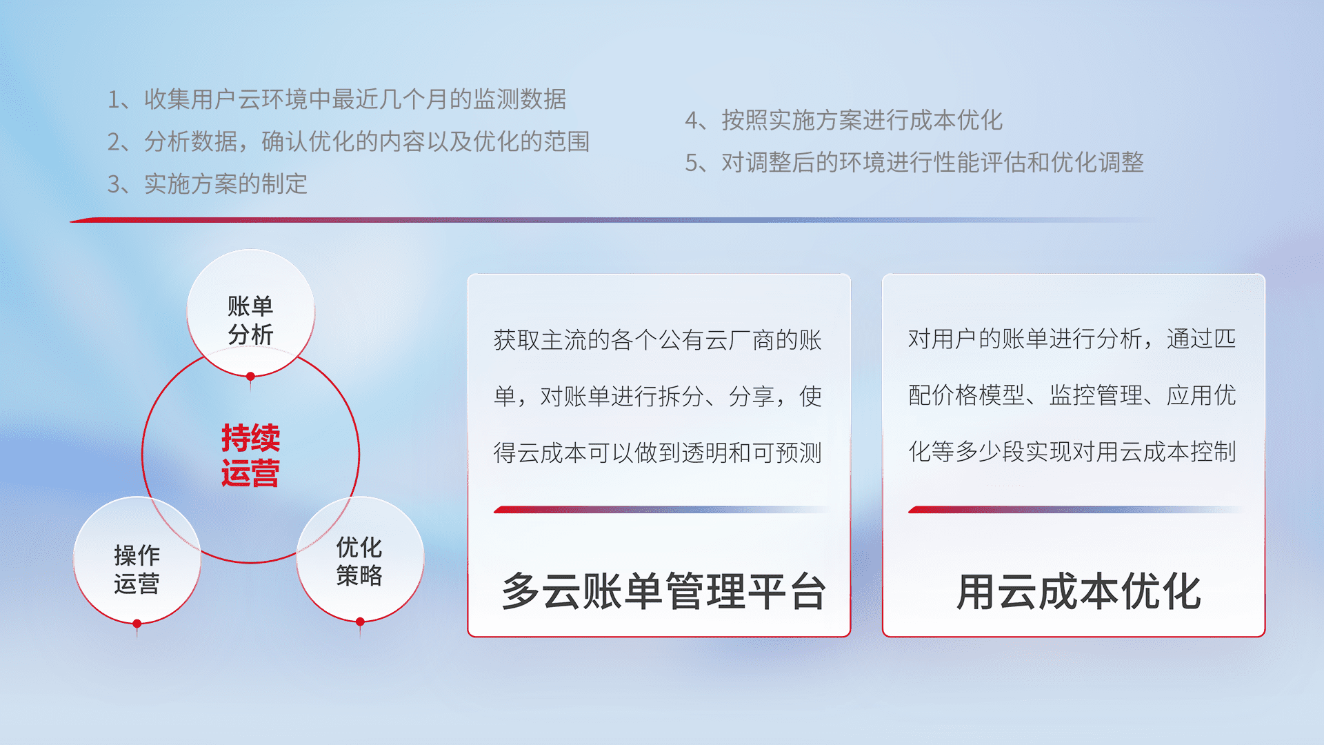 通过多云纳管,,,,以统一的资源数据模型把客户的云资源进行抽象和封装,,,,进而实现对多云资源的统一操作,,,保障云资源管理的可靠性、、稳定性与可用性。。。。量身定制化运维内容,,配置、、、、开发运维、、、补丁管理、、、备份、、、监控、、认证和访问管理、、、、审计和日常巡检等,,,保障在用云过程中的可靠度,,稳定度以及高可用率。。。