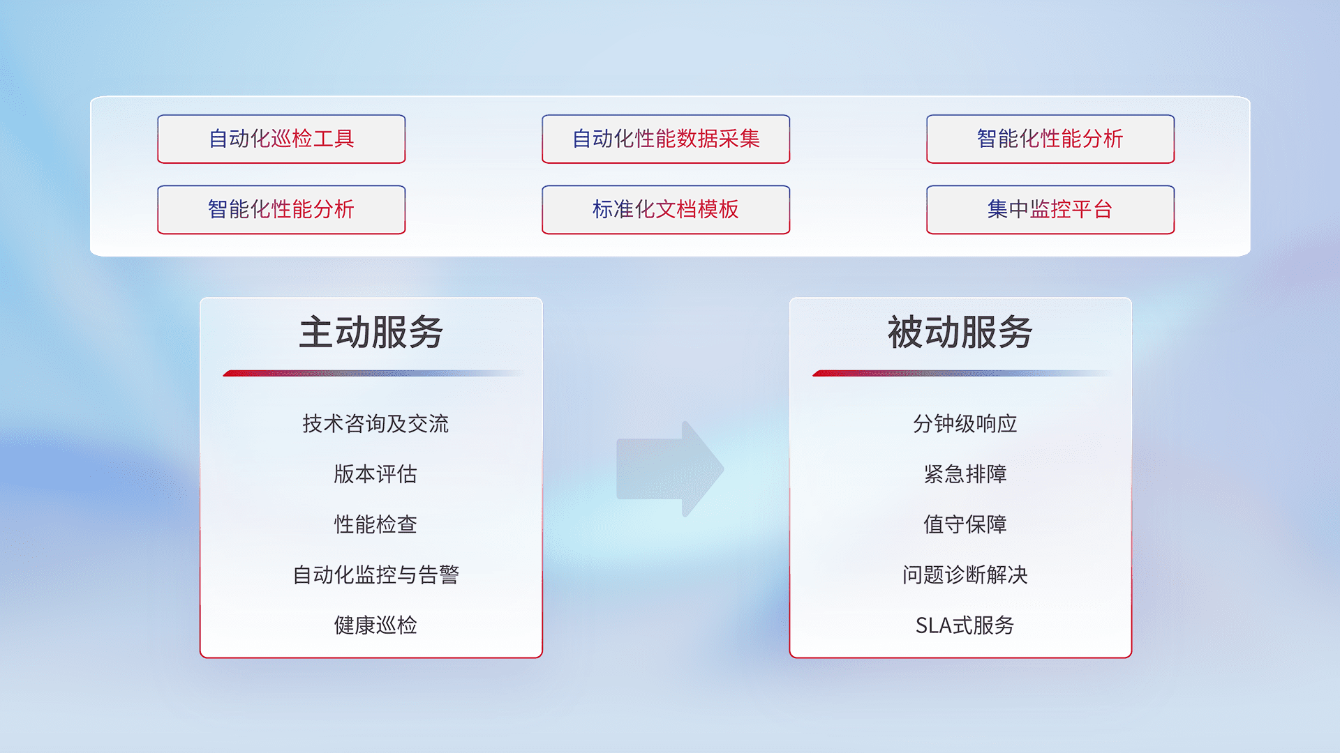 智能化工具和标准化文档,,,保障服务质量,,提供主动服务(包含技术咨询、、、版本评估、、、性能检查、、、自动化监控与告警、、健康巡检)和被动服务包含(分钟级响应、、紧急排障、、、、值守保障、、问题诊断解决、、、、SLA服务)。。。。